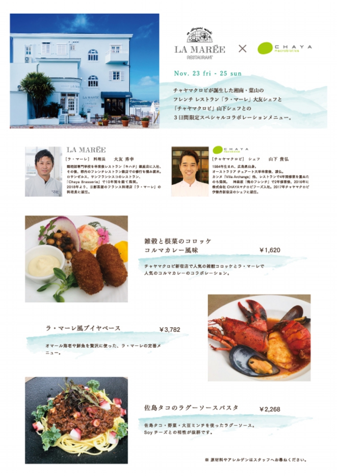 チャヤマクロビ伊勢丹新宿店では、11月23日(金)〜25日(日)の3日間、湘南・葉山のフレンチレストラン「ラ・マーレ」大友シェフと、「チャヤマクロビ」の山下シェフの3日間限定スペシャルコラボレーションメニューをご提供します。「ラ・マーレ」で人気のメニューや、湘南の近郊 佐島でとれたシーフードを使用したメニューなどをご用意しております。コラボレーションメニューはランチよりディナーまで終日お楽しみいただけます。17時以降はご予約も承ります。