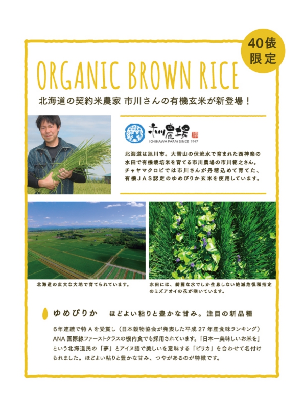 ブランドコンセプトといたしまして、通常、国産有機玄米を提供しております。