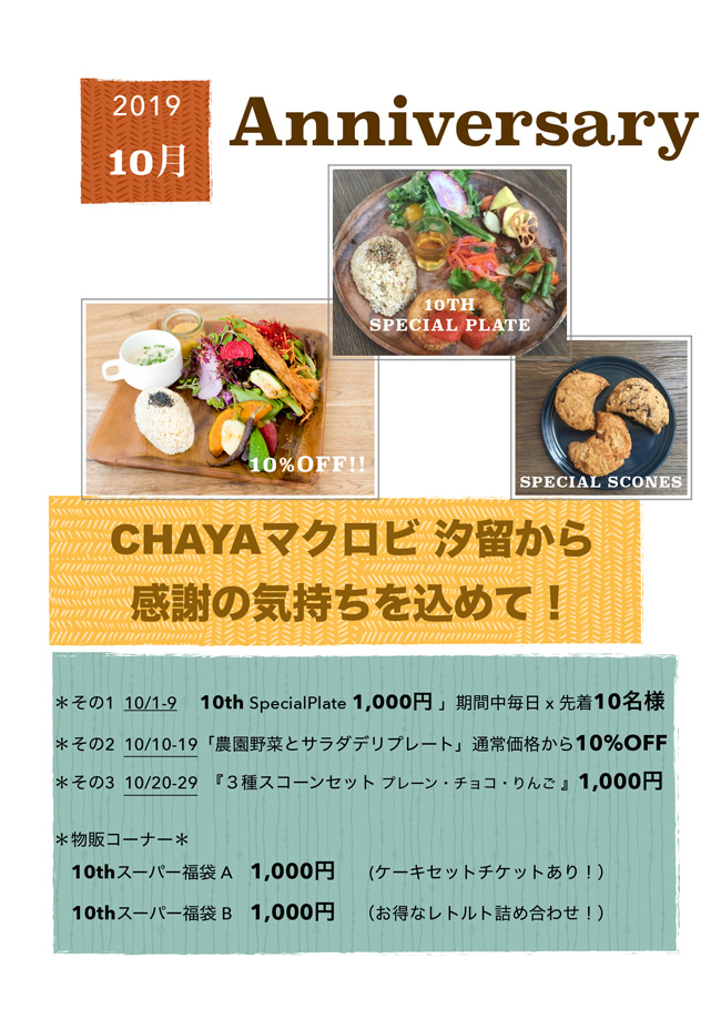 [ 2019.10.01 ] チャヤマクロビ ザ ロイヤルパーク 東京汐留店10周年感謝祭のお知らせ